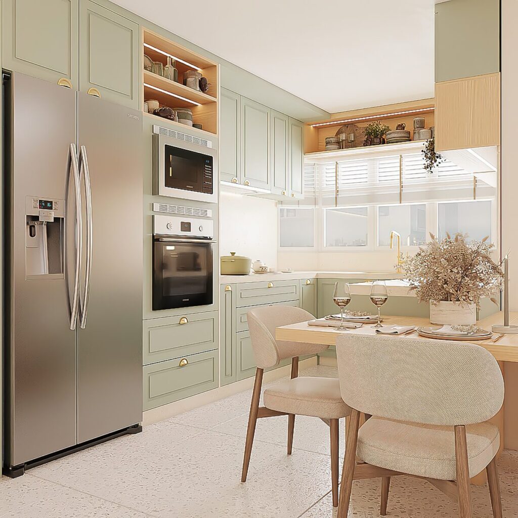 Por fim, planejar o espaço para os eletrodomésticos faz toda a diferença. Geladeira, forno, micro-ondas, lava-louças e pequenos eletros precisam ter locais definidos desde o início do projeto. Assim, a cozinha ganha um visual mais limpo, organizado e funcional, sem improvisos que comprometem a circulação e a estética.