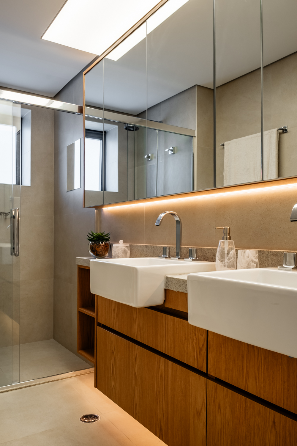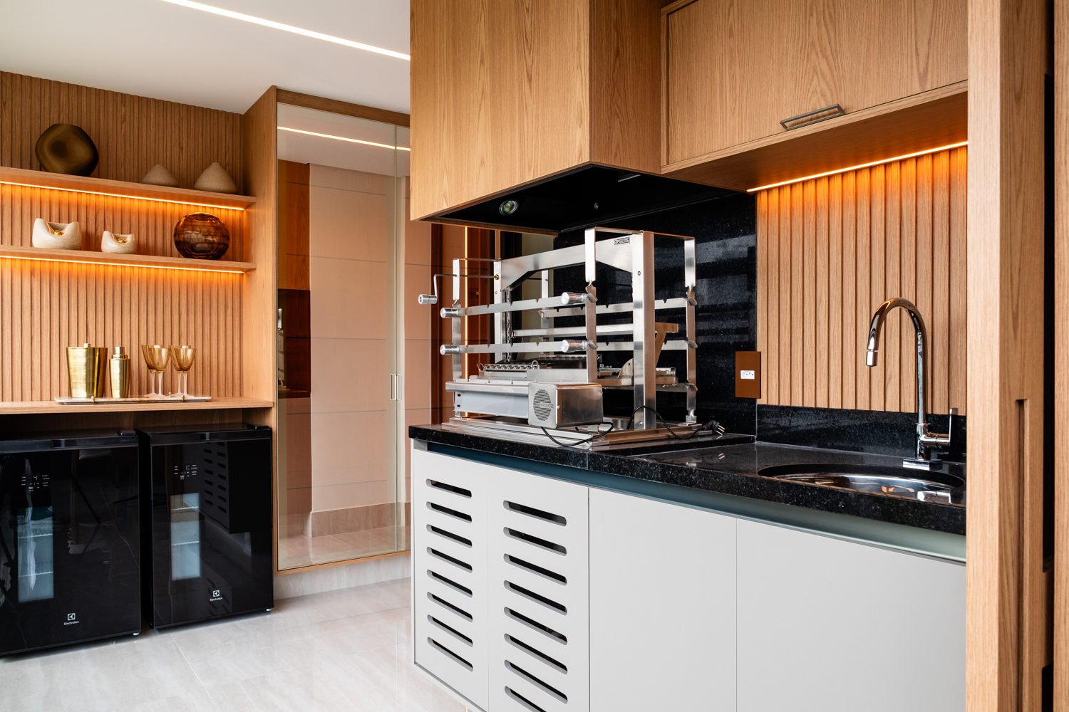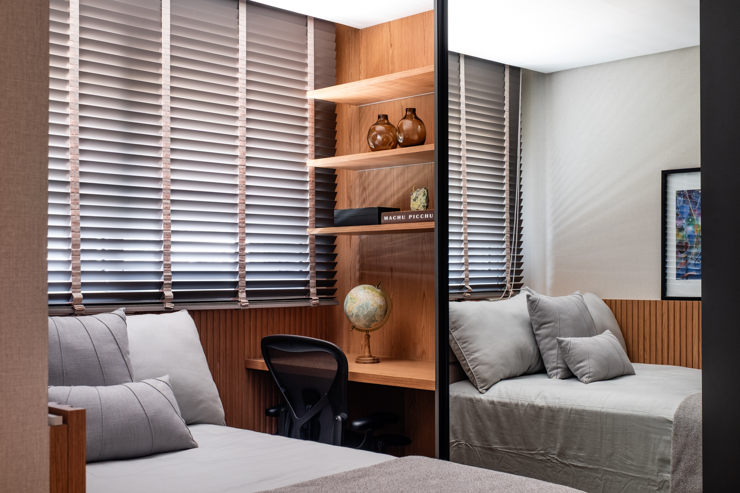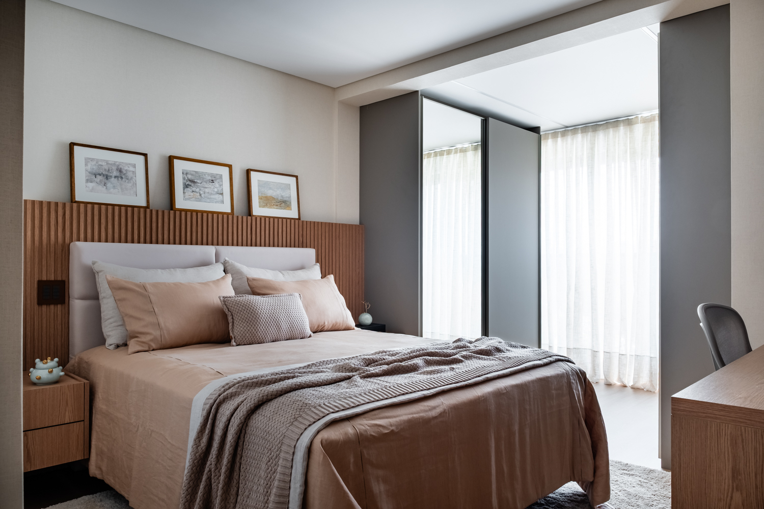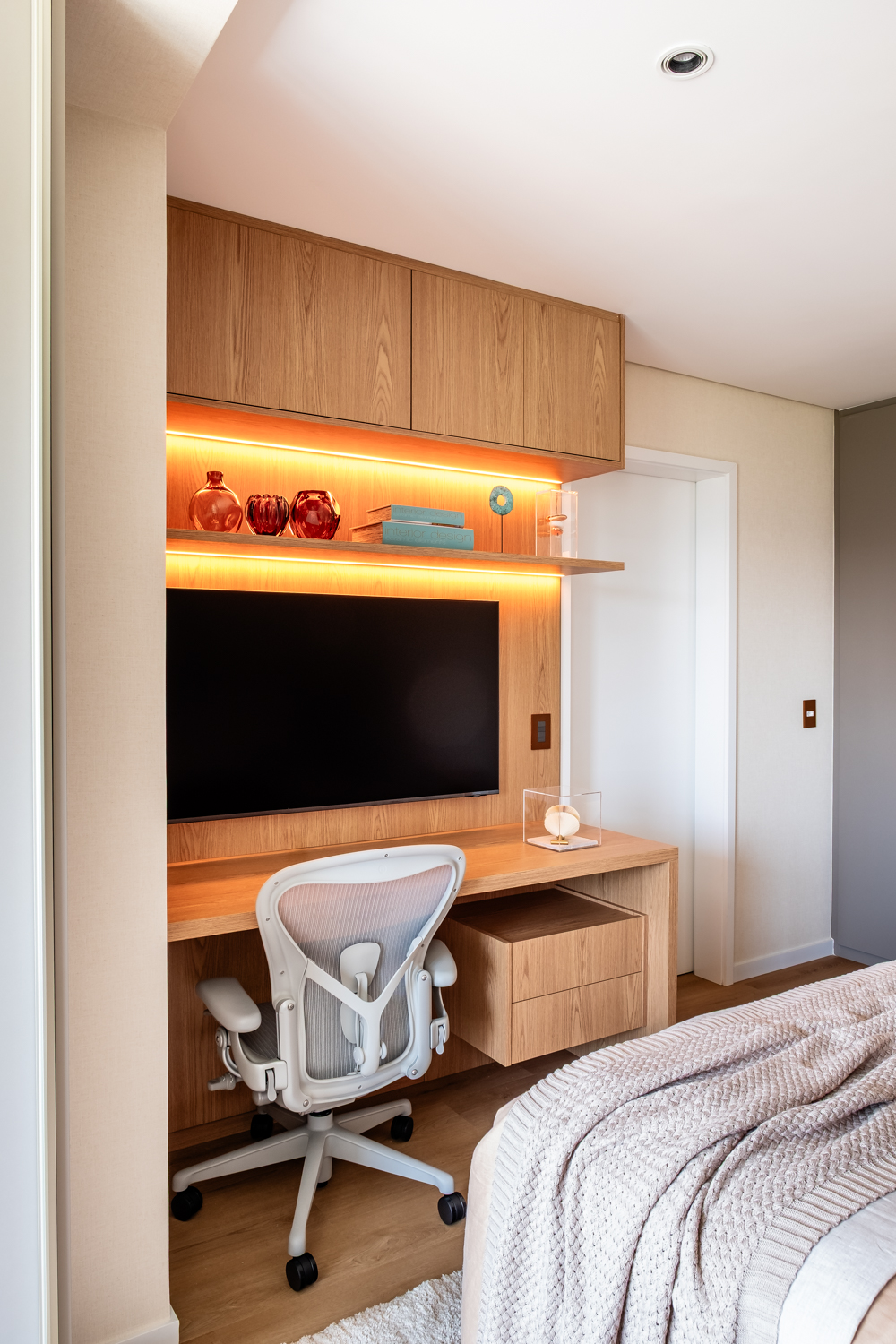 A proposta parte de uma base neutra e elegante, onde a marcenaria sob medida assume papel central na organização dos espaços, oferecendo soluções inteligentes de armazenamento e integração, sem abrir mão da estética refinada.