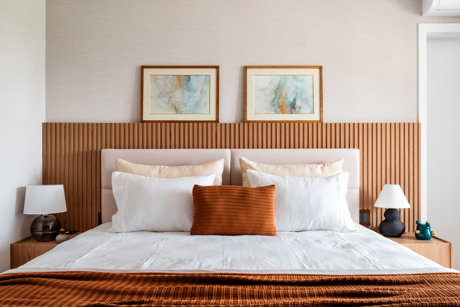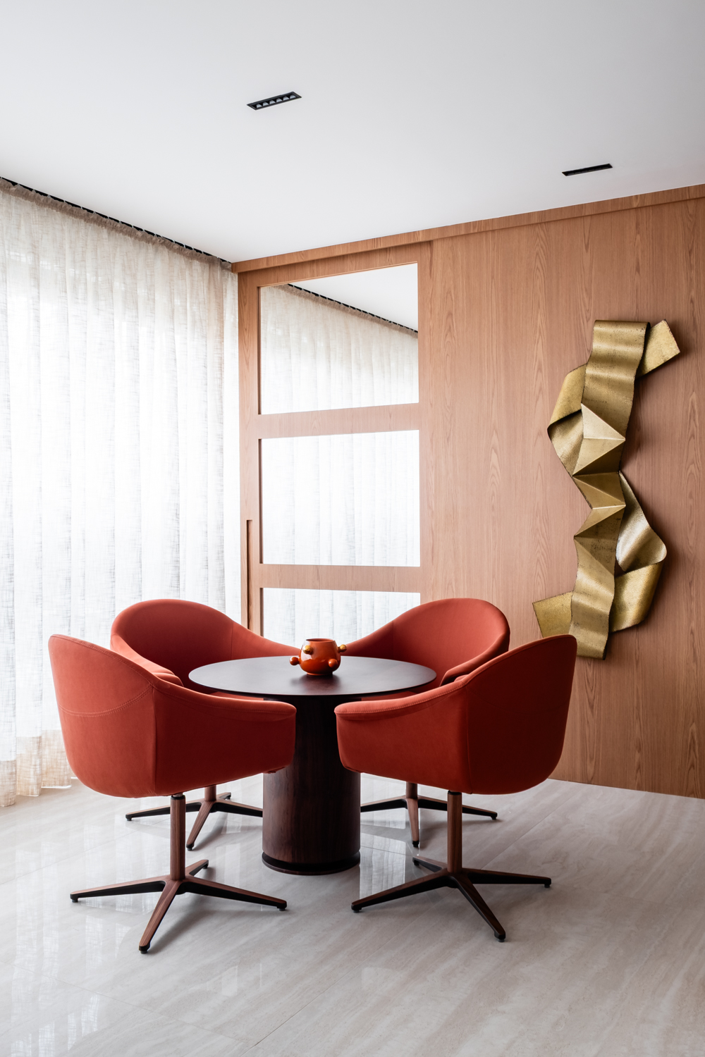 Um dos grandes destaques do projeto é a curadoria de obras de arte, tapetes e objetos de decoração, cuidadosamente selecionados para conferir identidade e profundidade aos ambientes. Cada elemento foi pensado como parte de uma composição equilibrada, valorizando texturas, proporções e pontos de destaque visuais.