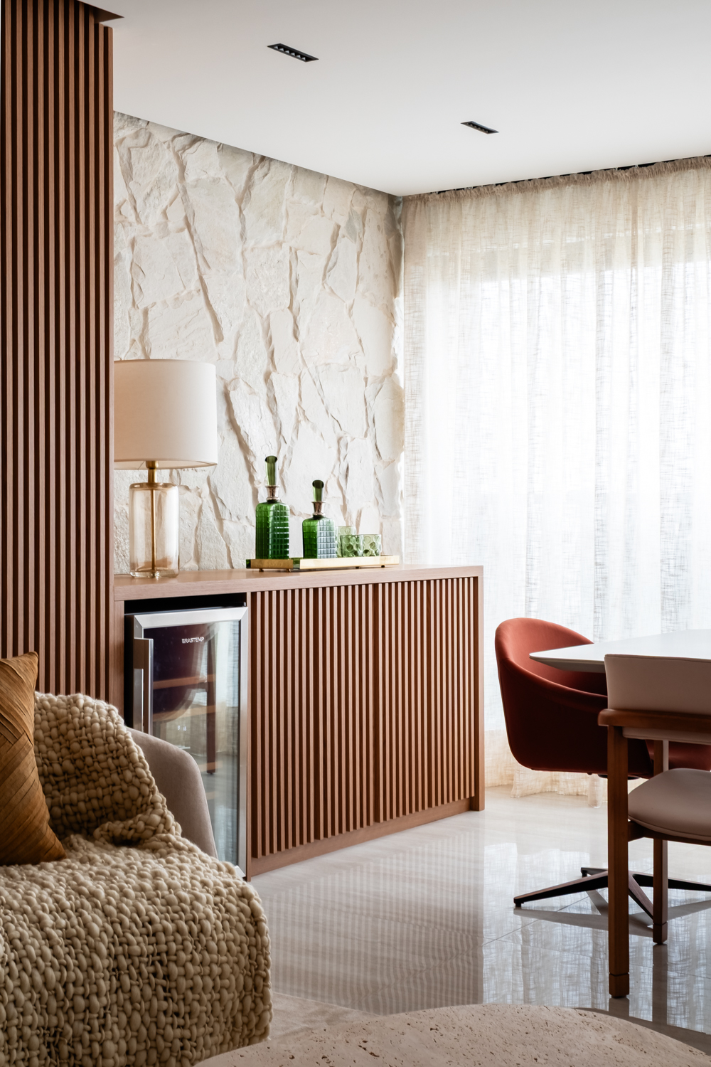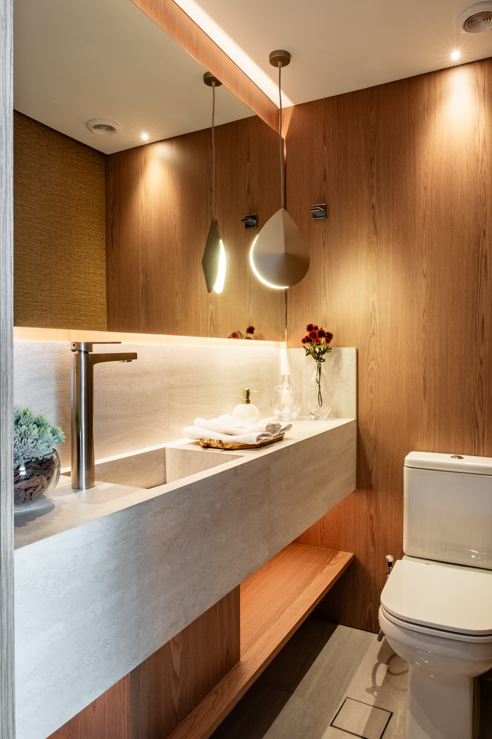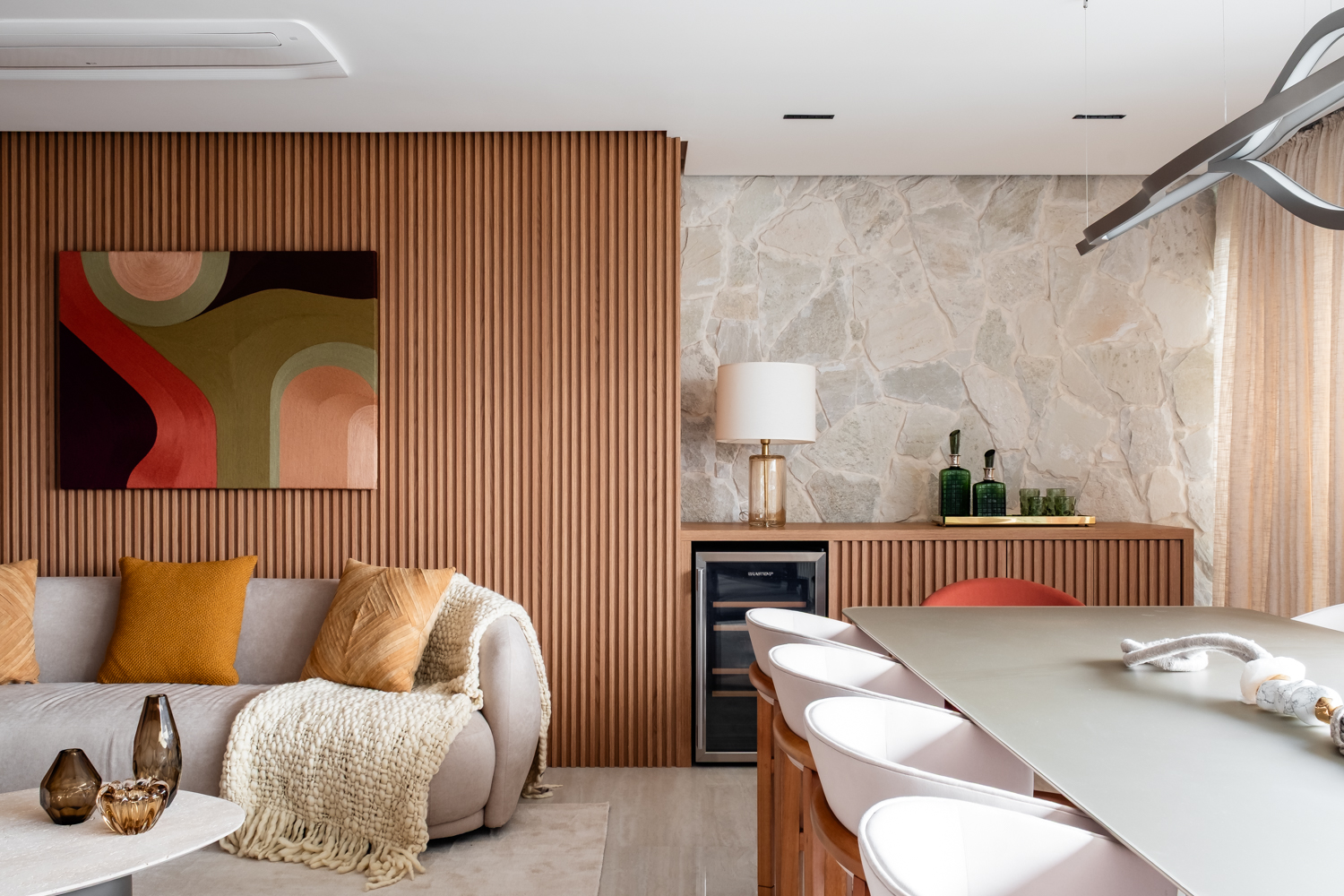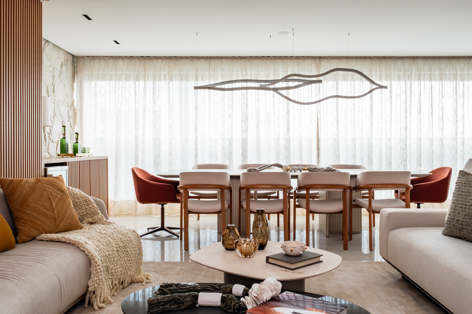 A iluminação foi trabalhada de forma estratégica para reforçar a atmosfera acolhedora, destacando materiais e criando diferentes cenários ao longo do dia. O resultado é um espaço que alia design contemporâneo, funcionalidade e sofisticação, traduzindo uma experiência de morar elegante e atemporal.