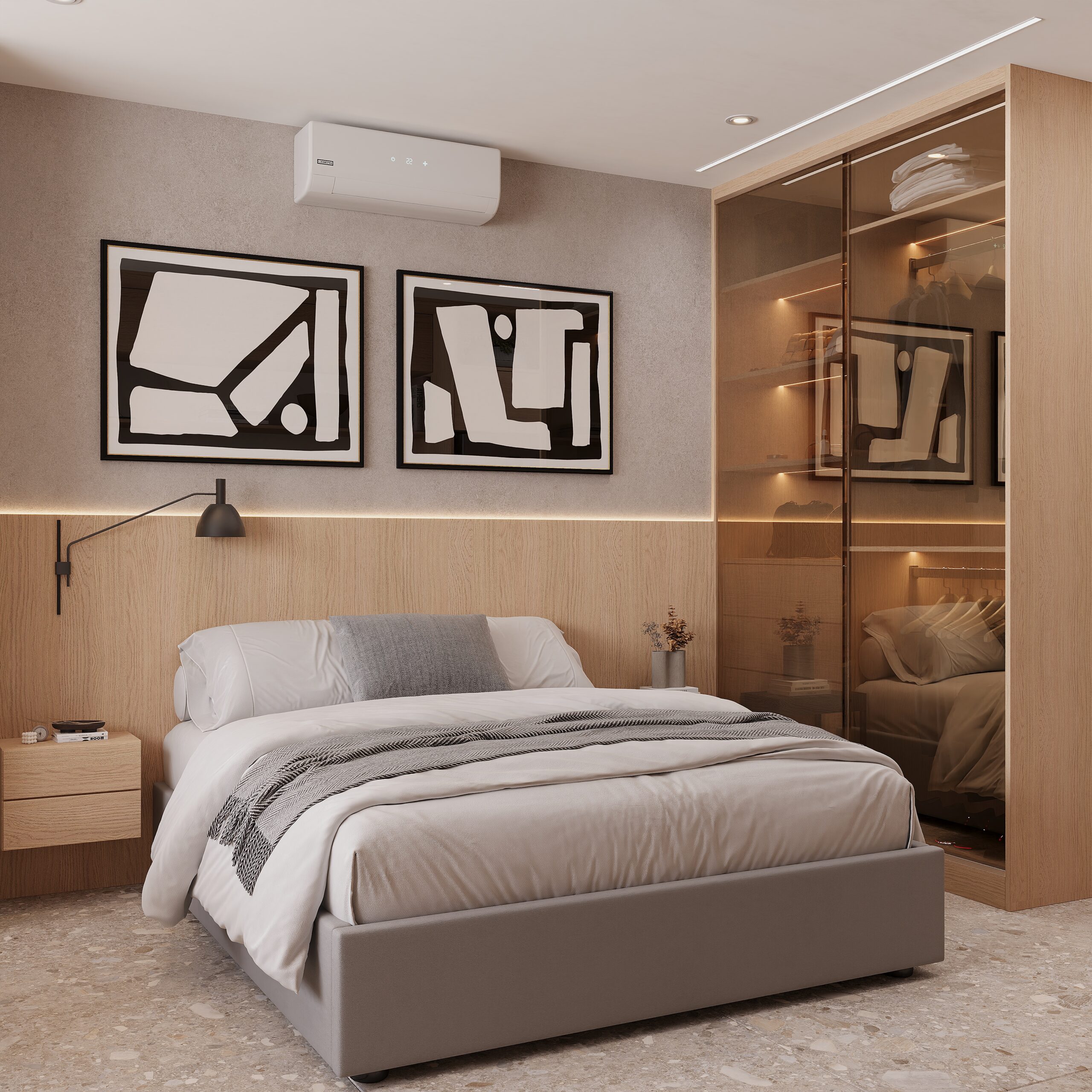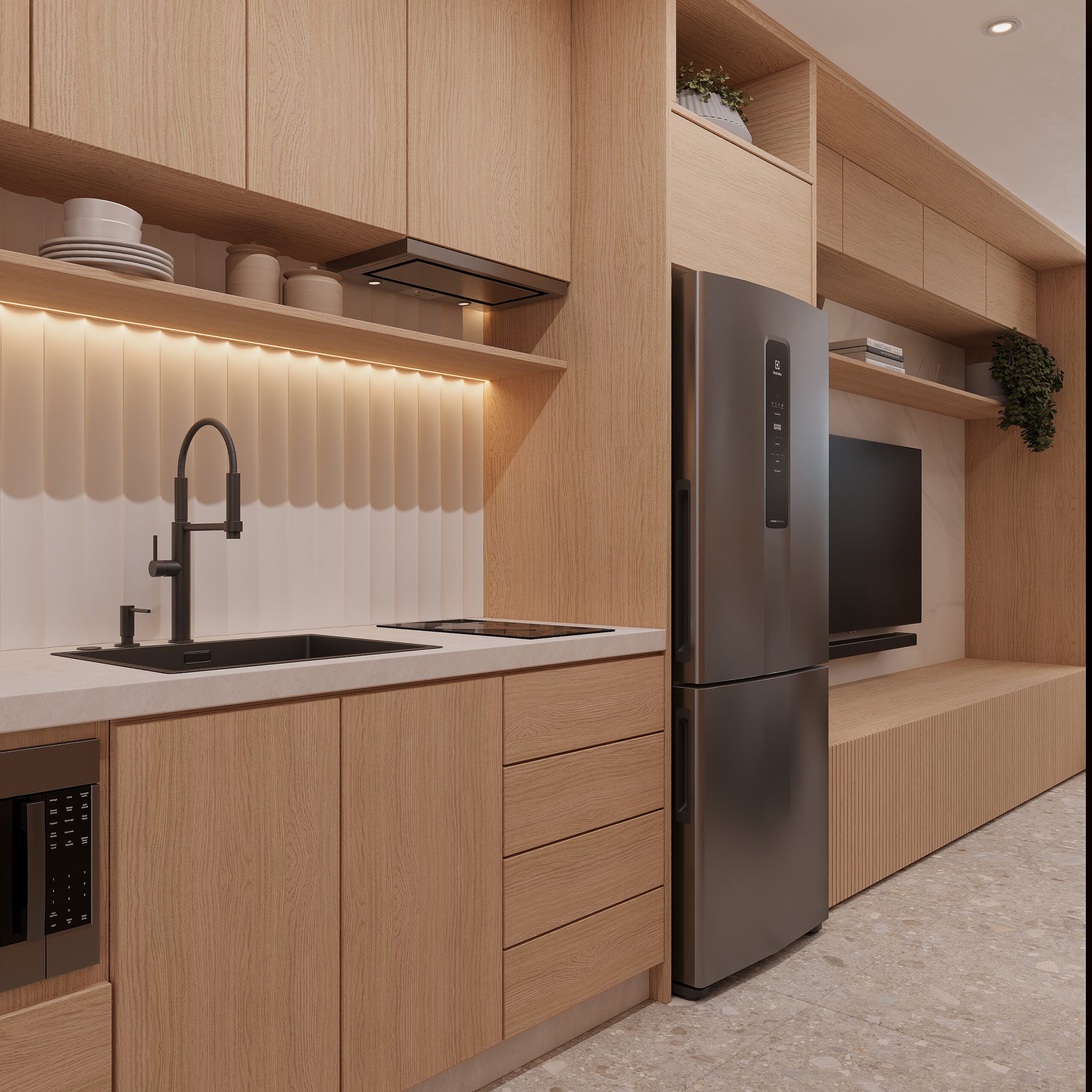 A integração entre os ambientes foi pensada para criar uma sensação de amplitude, enquanto o uso de materiais naturais, tons neutros e iluminação indireta contribui para uma atmosfera contemporânea e confortável — ideal para a rotina urbana.