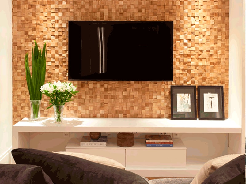 O uso de painéis de marcenaria também é uma solução interessante porque, além de funcionarem como um elemento decorativo, também combinam acabamentos diversos e iluminação. Eles podem esconder os fios da TV e dos equipamentos de som e vídeo.